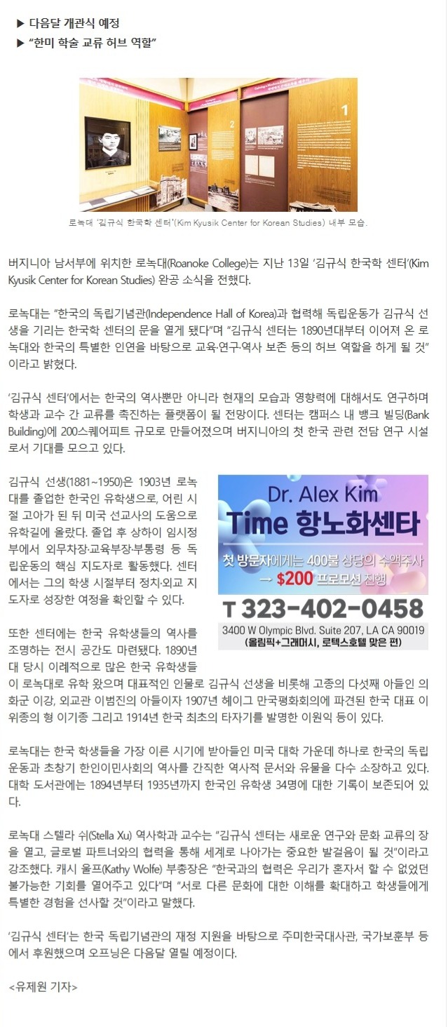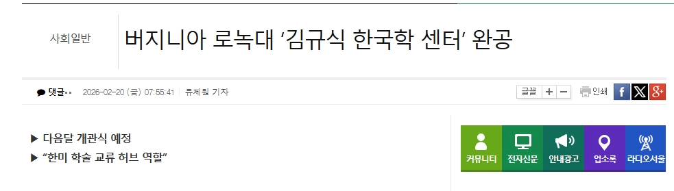 [¹ÌÁÖÇѱ¹ÀϺ¸]¹öÁö´Ï¾Æ ·Î³ì´ë ¡®±è±Ô½Ä Çѱ¹ÇÐ ¼¾ÅÍ¡¯ ¿Ï°ø |