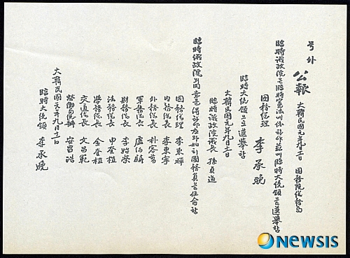 »çÁøÀº À̽¸¸ÀÌ ÀÓ½ÃÁ¤ºÎÀÇ ´ëÅë·ÉÀ¸·Î ¼±ÃâµÇ¾úÀ½°ú ±¹¹«ÃѸ® À̵¿ÈÖ ÀÌÇÏ °¢ºÎÃÑÀåÀÌ ÀÓ¸íµÇ¾ú´Ù´Â ³»¿ëÀÇ ´ëÇѹα¹ÀÓ½ÃÁ¤ºÎ °øº¸ È£¿Ü. (»çÁø=µ¶¸³±â³ä°ü Á¦°ø) /ÀÌÁ¾ÀͱâÀÚ 007news@newsis.com